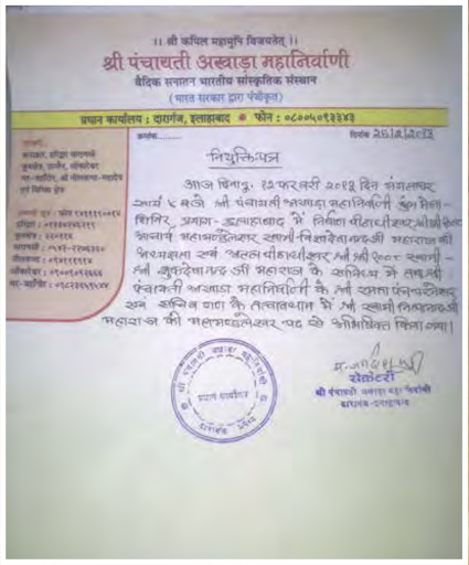 Letter of Appointment Which officiates The SPH as Mahāmandaleśvar of the Mahānirvaṇi Akhāḍā