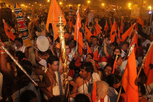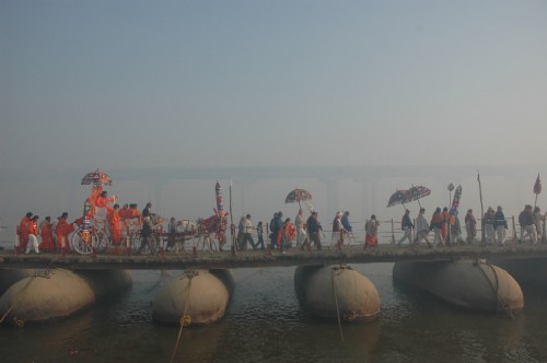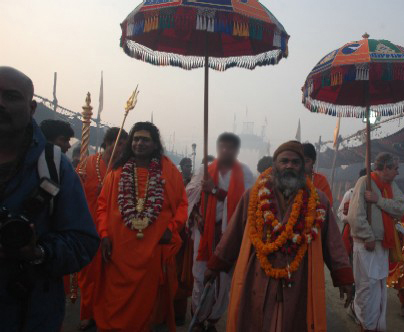 In the 2007 Kumbh Mela at Allahahad (Prayag) in North India, The Supreme Pontiff of Hinduism was honored with the royal chariot of the Mahanirvani Peetha as the Mahāmanḍaleśvar, and enthroned on it, He led the sacred procession of all the 14 Akhadas to the Triveni Sangamam (Confluence of the three sacred rivers) where He took the first dip – Shahi Snan (Royal Bath) and following Him the remaining akhadas and millions of people dipped in the sacred confluence.