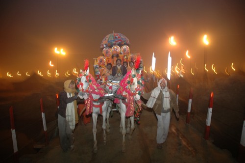 As per the ancient customs of the sacred kingdom of the Mahanirvani Peetha, The Supreme Pontiff of Hinduism honored the lineage of Śrī Paramaśiva and all His successors, mounted on the throne chariot of the Divine Kingdom, adorned with the traditional crown and the royal paraphernalia. On the evening of 12th February 2013, a sacred procession took place marking the prestigious celebrations. All the citizens and devotees of the Kingdom at the Kumbh Mela (Prayag, North India) received His direct blessings.